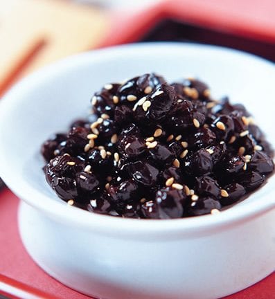 精选影音 炖黑豆 【材 料】 黑豆 2杯 芝麻 2小匙 【调 味 料】 酱油 2/3杯 糖 1/2杯 【做 法】 1.黑豆洗净后泡软,放入滚水中煮约3分钟即捞出沥干备用。 2.再将黑豆放入锅中加水至刚好淹过的高度,再倒入酱油拌匀,以小火慢炖至熟透后加糖继续炖3分钟,熄火盛出后撒上芝麻拌匀即可食用。