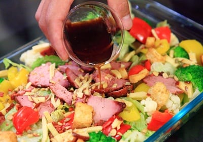 所有材料摆入盘中后,再淋上和风酱、加入少许面包丁、坚果与乳酪丝即完成。