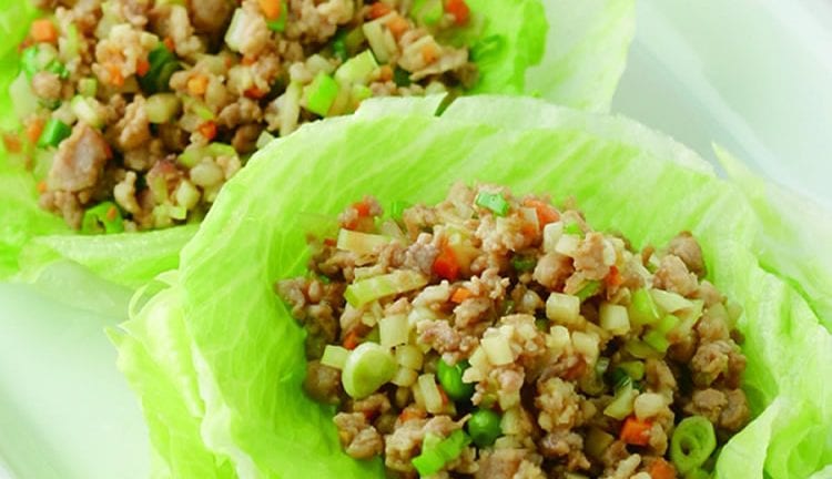 精选影音 炒牛肉松夹生菜 【材 料】 牛绞肉 300公克 红萝卜 20公克 荸荠 80公克 芹菜 30公克 香菇 20公克 葱 20公克 姜 20公克 太白粉水 1小匙 西生菜叶片 适量 【调 味 料】 酱油 1大匙 鸡粉 1小匙 米酒 1大匙 香油 1小匙 糖 1小匙 白胡椒粉 1小匙 【做 法】 1.红萝卜、荸荠、芹菜、香菇、葱、姜均切成末;西生菜叶片剪成碗大小的圆片状,备用。 2.热锅,倒入适量的油,放入作法1的香菇末、葱末及姜末爆香。 3.加入牛绞肉炒至变白,再加入作法1的红萝卜、荸荠、芹菜末及所有调味料炒匀,以太白粉水勾芡。 4.将作法3的材料以西生菜叶片包起食用即可。