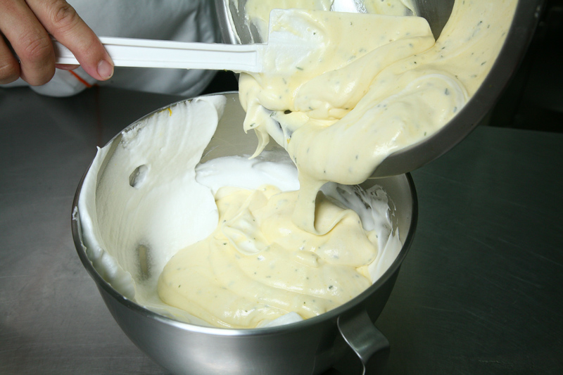 再依序倒进蜂蜜、沙拉油、牛奶与过筛后的面粉与迷迭香末,将1/3打好的蛋白先加进蛋黄糊中拌匀,之后全部倒回剩下的蛋白中拌匀。