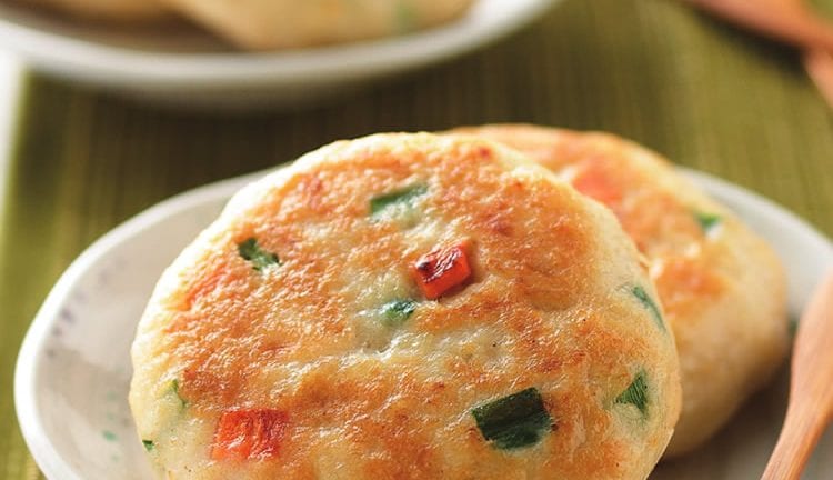 精选影音 香煎鱼饼(2) 【材 料】 鱼浆 300公克 鱼肉丁 50公克 马蹄末 80公克 红萝卜末 15公克 姜末 5公克 蒜末 5公克 韭菜末 25公克 洋葱末 15公克 蛋液 1颗 地瓜粉 适量 【调 味 料】 盐 少许 糖 1/2小匙 胡椒粉 少许 【做 法】 1.鱼浆加入蛋液及所有调味料拌匀,再加入其余材料拌匀,摔打数下至有黏性后,捏成数个圆饼状(手中可抹少许油避免沾黏),即为鱼饼,备用。 2.取一平底锅加热,加入适量的沙拉油,再放入作法1的鱼饼,用小火煎至一面熟后,翻面用锅铲略压平鱼饼,煎至里外皆金黄熟透即可。